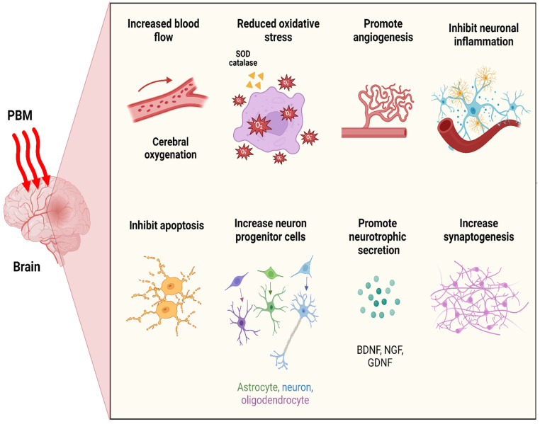 PBM enhances mitochondrial energy production in brain cells, increasing cerebral blood flow, and promoting neuroplasticity through increased brain-derived neurotrophic factor (BDNF).