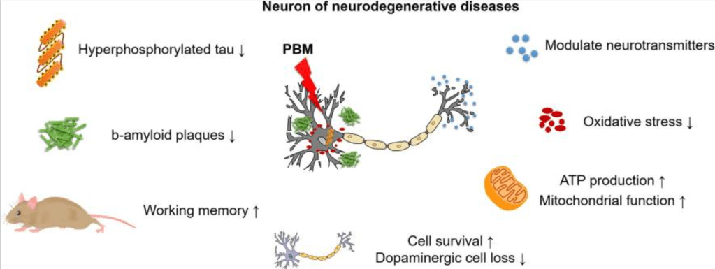 - Brain Injury and Neurodegenerative diseases: PBM has been TBI, stroke, Parkinson’s, Alzheimer’s, autism, ALS and MS in reducing symptoms, to be neuroprotective and to regenerate neurons.