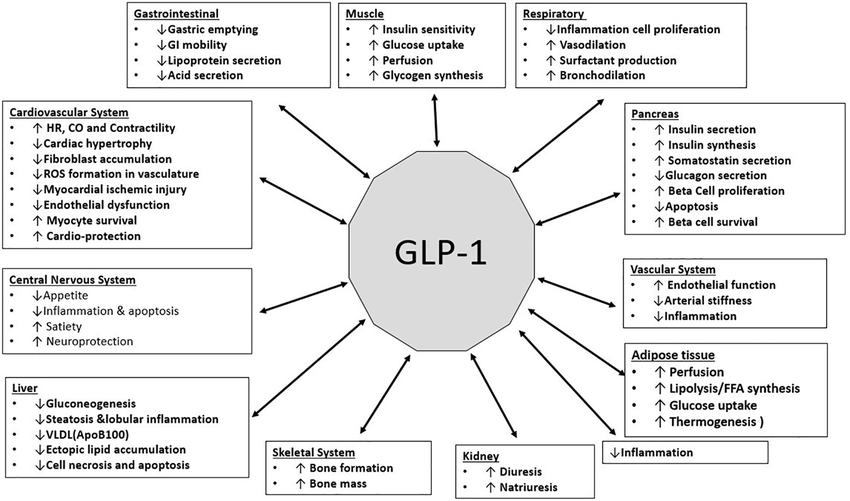 - Cardiovascular function: GLP-1 can improve cardiac function by increasing glucose uptake, improving coronary flow, and secreting atrial natriuretic peptide (ANP). They also decrease atherosclerosis and platelet activation.