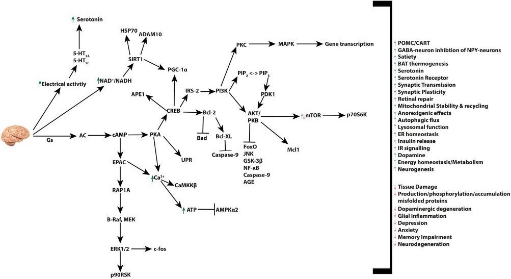 - Brain function: in the brain GLP-1 affects satiety, thermogenesis, neurogenesis, neurodegeneration, retinal repair, and energy homeostasis.